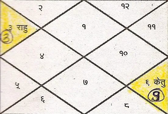 Another thing is that when the head portion was cut off, it saw Sun and Moon sitting behind Vishnu. Rahu realised that it is these 2 fellows who complained against him. That's why Rahu and Ketu keeps enmity against Sun and Moon. This is also the reason why Rahu and Ketu eclipses Sun and Moon only. They never eclipse any other planet. So, if we really want to see Rahu and Ketu in sky, we should look at the north and south points of Sun or Moon when these planets go into eclipse. That's why Rahu is called North Node of the Moon and Ketu is called South Node of the Moon. This is also the reason why in any horoscope Rahu and Ketu are always at 180* from each other. Like in the horoscope attached, Rahu is at 3rd house and Ketu is at 9th house. Now, if Rahu moves to 4th house, Ketu will move to 10th house. They are always at 180* from each other.